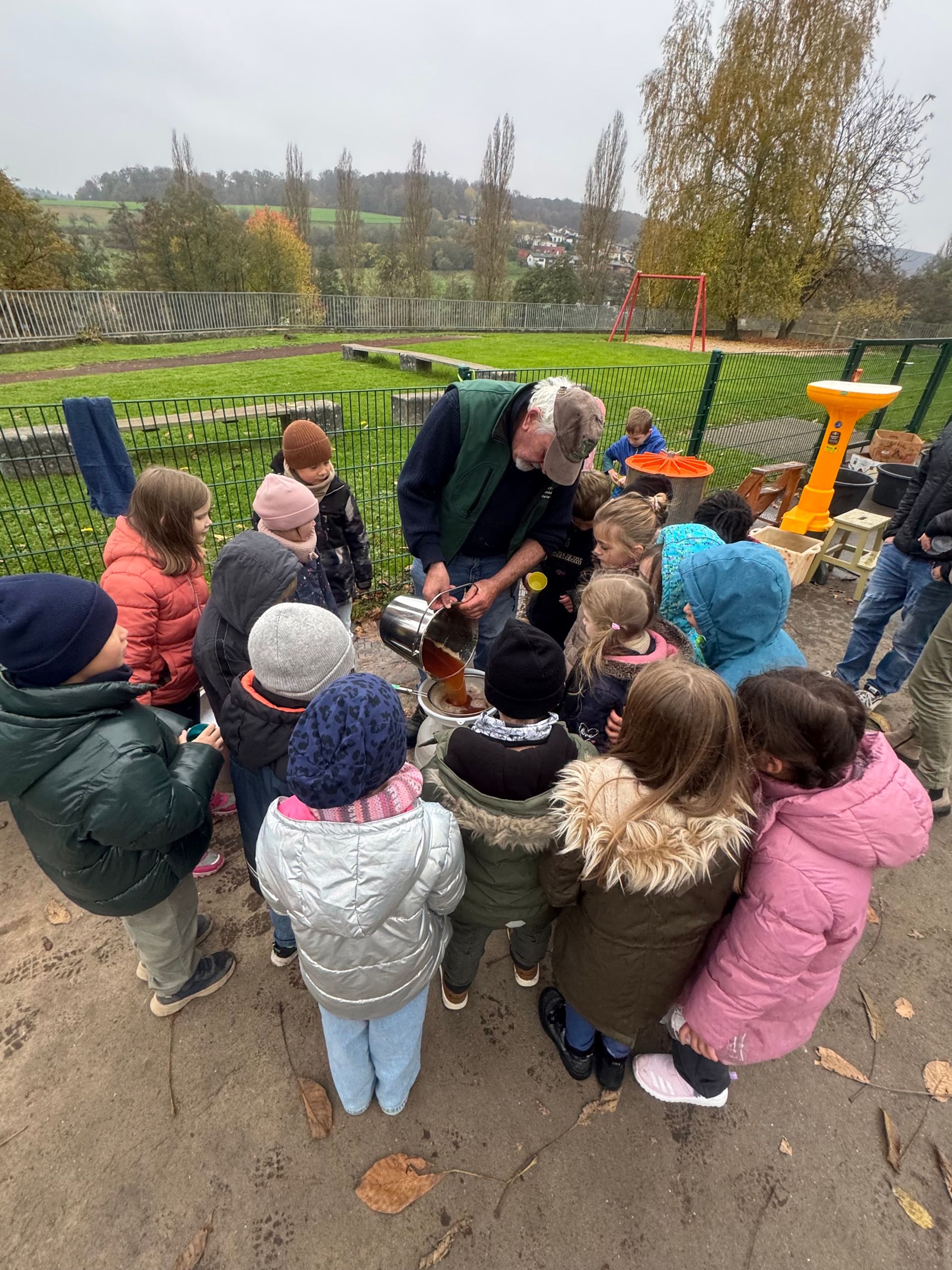 Jetzt kam der spannende Moment des Kostens des frischen Mostes. Die Kinder hatten Becher und Flaschen mitgebracht, um den frischen Apfelsaft abzufüllen. Das war beim Kosten dann ein "Aha-Erlebnis", das viele Kinder so noch nicht gehabt hatten: