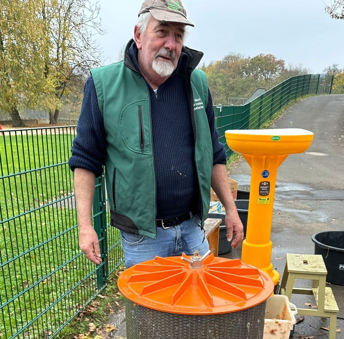 Frischer Saft, nicht aus dem Supermarkt. Auch Georg Hager, seines Zeichens gelernter Gärtnermeister und Landschaftsbauer, gab noch einige Erläuterungen und sorgte mit Karlheinz Gerlach für einen reibungslosen Ablauf des "Kelter-Acts" auf dem Schulhof.